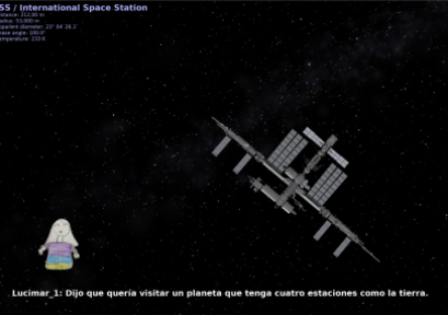Para el armado de la “nave espacial” utilizamos una netbook Conectar Igualdad con Huayra como sistema operativo y un proyector. De este modo la proyección simula la ventana delantera de la nave espacial en la que viajamos. En el caso de la implementación en el espacio Bahía HUB contamos con unas sillas altas que dispuse agrupándolas frente a la proyección para que simularan los asientos de la nave.