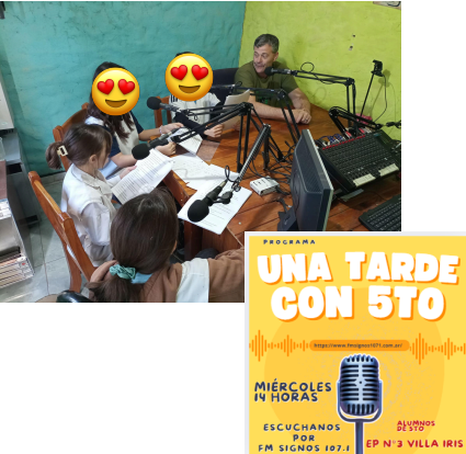El proyecto “Una tarde con quinto” nació con la idea de vincular la escuela con la comunidad a través de la radio, un medio cercano y accesible. Fue llevado adelante por estudiantes de 5° grado de la Escuela Primaria N° 3 de Villa Iris, quienes planificaron, produjeron y condujeron un programa radial semanal. A lo largo varias semanas, los chicos trabajaron en equipo de a 4, para investigar temas, escribir guiones, grabar, diseñar la promoción del programa y participar de su emisión en vivo por FM Signos 107.1.
